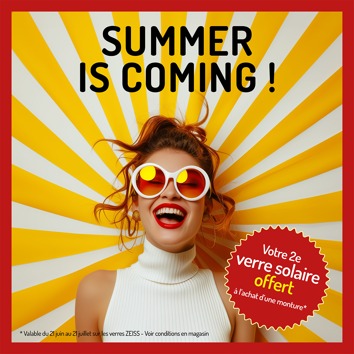 L’été arrive (enfin) ! Protégez vos yeux avec style et profitez d’un verre solaire de qualité ZEISS à votre vue offert à l’achat de n’importe quelle monture.